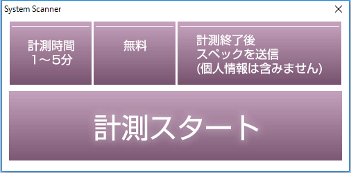 System Scannerは、コンピュータの「使い心地」を100点満点で評価します。性能を表示・評価するソフトはたくさんありますが、単位がソフトごとに異なり、何万というスコアが表示されても覚えきれません。皆様が小学生のころの100点満点のテストを受ける感覚で、表示できればと思い制作しました。