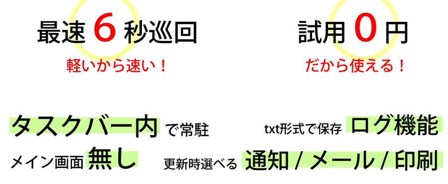 ・Twitterや2chなど、情報の流れが速くなったこと、通信回線やコンピュータの高速化を鑑み、最短で設定可能な巡回間隔を1分から、フリーソフト最速の6秒(0.1分)に修正。(2016/7/15) |