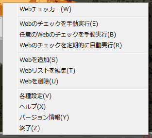 Webチェッカーは、Webサイトの更新を自動でチェックするソフトです。巡回ソフトは他にも多数あり高機能なものもありますが、このソフトの大きな特徴は「メイン画面がなく、直感的なポップアップメニューのみで操作。タスクバー内で常駐すること」 Webチェックという基本に立ち返ると、メイン画面や難しい設定画面など不要なことがわかりました。シンプルな機能を簡単・確実に実行できます。 ソフト本体のダウンロードはこちらから 有料機能のご購入 |